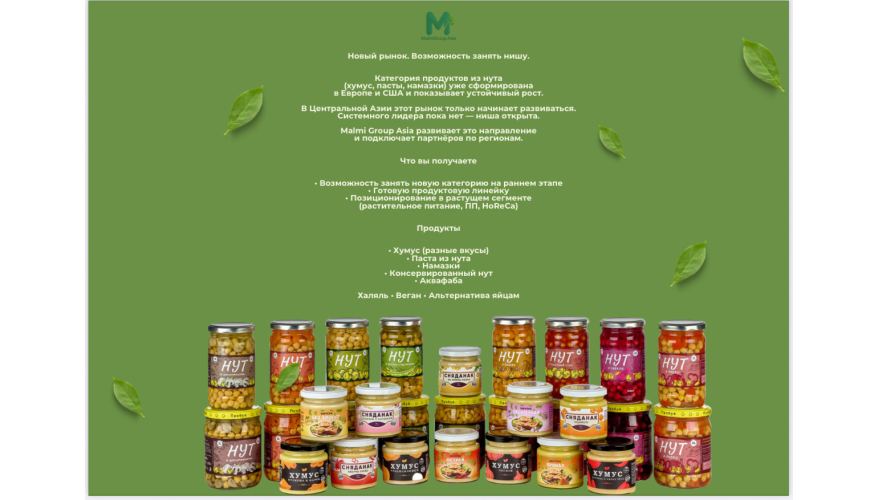 Malmi group Asia — торговый дом завода-производителя по центральной Азии,  продукции из нута: хумус, готовый и консервированный нут, намазки и аквафаба. Наша команда ищет  партнеров в работе по регионам и странам Центральной Азии