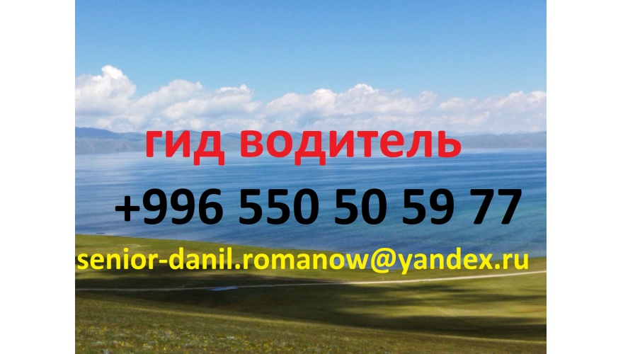 Привет! Меня зовут Данил. Вот уже 15 лет я занимаюсь составлением маршрутов и экскурсий по красивейшим уголкам Кыргызстана. Кыргызстан это шикарные виды, вкусная еда, древняя культура и традиции. Каждый раз, путешествуя в разные уголки моей Родины, я до сих пор не перестаю удивляться этим великолепным видам. Я помогу подобрать интересный маршрут, в который мои гости могут внести свои изменения. Могу помочь с поиском гостиницы, квартиры. Предлагаю услуги водителя, гида (свободно говорю на английском, французском и русском языках) трансферы в аэропорт, могу вас встретить в горах после трэкинга в разных уголках страны. Можете писать мне на WhatsApp или на электронный адрес—ваш частный гид в Киргизии Даниил. Tel: +996 550 50 59 77, WhatsApp: +996 550 50 59 77,