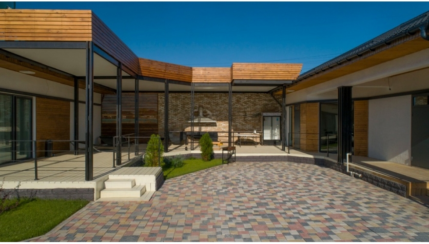 Из зала большие панорамные раздвижное двери и выход на большую, крытую террасу, где расположено все для приготовления барбекю (мангал, коктальница, тандыр), летом устанавливается большой бассейн (4*8), комфортное, обустроенное и организованное место для жизни и ваших гостей!