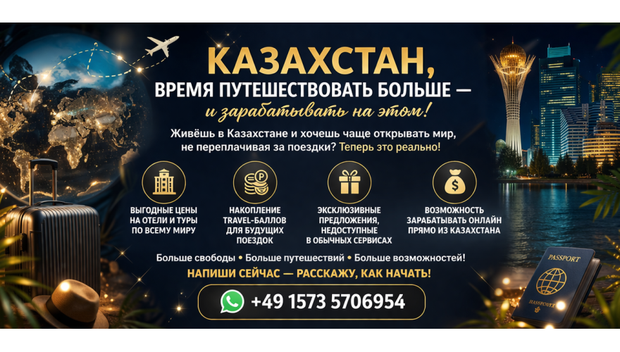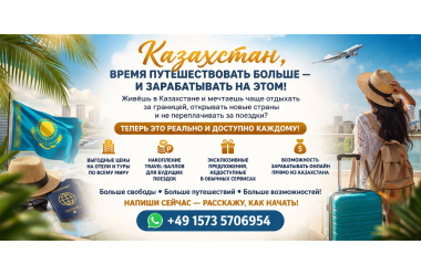 Мечтаешь путешествовать чаще — и по миру, и по нашему родному Казахстану — при этом создавая стабильный доход прямо в телефоне? Теперь это реально — и доступно каждому! Мы развиваем международный проект, который объединяет выгодные путешествия с возможностью дополнительного дохода Что тебя ждёт: ✔️ Возможность выстроить систему пассивного дохода, которая приносит деньги, даже когда ты отдыхаешь. ✔️ Выгодные цены на отели и туры по всему миру ✔️ Накопление travel-баллов для будущих поездок ✔️ Эксклюзивные предложения, недоступные в обычных сервисах ✔️ Возможность зарабатывать онлайн прямо из Казахстана ✔️Тебе не нужно быть экспертом. Мы всему научим и доведем до результата в нашей команде! Почему это идеально для тебя? Не важно, где ты: Алматы, Шымкент, Атырау или маленький городок. Нужен только интернет. Свободный график: уделяй проекту столько времени, сколько хочешь. Никаких рисков — только новые возможности и окружение успешных людей. Дополнительный доход без сложностей Простая система рекомендаций: рассказывай другим — и получай вознаграждение Сделай шаг к жизни без ограничений Больше свободы, больше путешествий, больше возможностей Напиши сейчас — расскажу, как начать и отвечу на все вопросы WhatsApp: +49 1573 5706954 Instagram: @jana_gussar Facebook: Jana Gussar